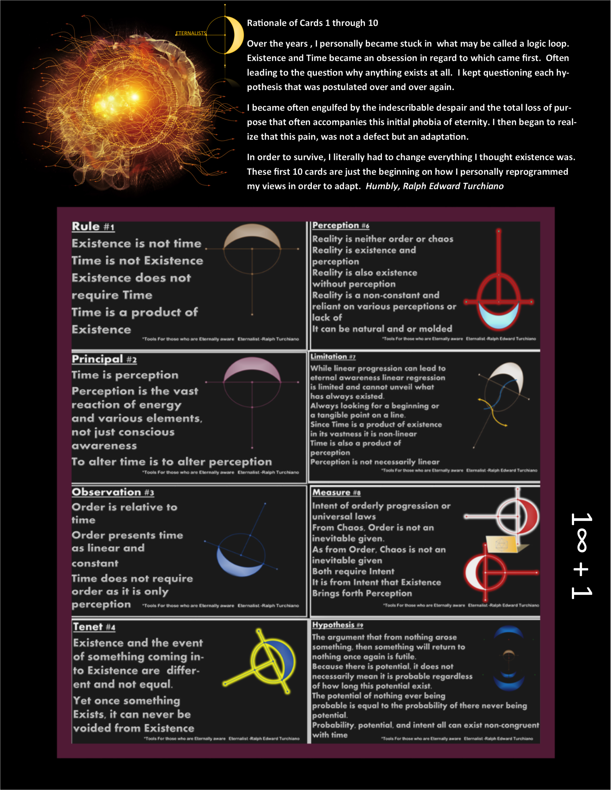 In order to survive, I literally had to change everything I thought existence was. These first 10 cards are just the beginning on how I personally reprogrammed my views in order to adapt. Humbly, Ralph Edward Turchiano